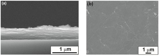 The SEM images of the MXene film obtained on a glass substrate are presented in Figure 3. The thickness of the obtained MXene films was about 500 nm (Figure 3a). On the surface of the MXene film, the boundaries of individual MXene flakes located in the plane of the film are clearly distinguished (Figure 3b). Ti3C2Tx flakes are stacked on top of each other, forming a film with high conductivity.