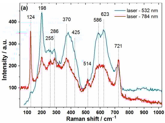 In order to analyze the structural peculiarities and surface chemistry of the obtained Ti3C2Tx MXene films, we applied Raman spectroscopy as a sensitive tool for studies of features of 2D materials [39]. Figure 4 presents the Raman spectra of Ti3C2Tx MXene films (where T is O, F and OH functional groups) recorded at different excitation wavelengths. The observed peaks were deconvoluted with a Lorentz function and showed several active Raman modes (Eg and A1g) characteristic for Ti3C2Tx particles. The peak at 124 cm−1 is observed only when MXenes are excited with a 785 nm laser, the wavelength of which falls into the maximum of the plasmon band in the MXene absorption spectra. According to the literature data [40,41], the peaks at 198, 623 and 721 cm−1 are related to out-of-plane stretching vibrations of titanium and carbon atoms. The Eg modes at 255, 286 and 370 cm−1 can be assigned to in-plane vibrations of F, OH and O functional groups, respectively. The A1g modes at 425, 514 and 586 cm−1 are also related to in-plane vibrations of F, OH and O groups attached to titanium atoms, respectively. The position of Raman modes does not depend on excitation laser wavelength. It should be noted that the observed Raman peaks from the MXene film are broad and overlap, which indicates a strong termination of the surface of the MXene sheets with F, OH and O groups. Moreover, the spectrum does not contain the peaks at 228 and 599 cm–1, which are characteristic of Ti3C2 monosheets without surface termination [41]. It is also important to note that the Raman spectra of MXenes differ from those of the precursor—Ti3AlC2 MAX phase (Appendix B, Figure A3). In the spectrum of MAX phase, there are several sharp peaks at 182, 194 and 262 cm−1 and more broad peaks at 350, 575 and 632 cm−1. These results are in good accordance with the data reported previously for Ti3AlC2 phase [42]. It can be concluded that the disappearance of the peaks at 182 and 262 cm−1 after etching of the MAX phase is apparently associated with the active participation of aluminum atoms in the formation of these modes.