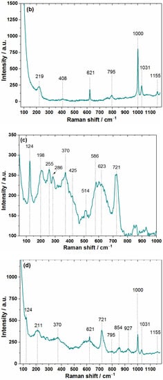 Figure 4b–d demonstrate the Raman spectra of polymer-coated MXene films. Raman signals from MXenes are not detected through rather thick PSt coating (Figure 4b). The observed peaks are related to principal Raman bands of PSt (621 cm−1 (ring deformation mode); 795 cm−1 (C-H out-of-plane deformation); 1000 cm−1 (ring breathing mode); 1031 cm−1 (C–H in-plane deformation); 1155 cm−1 (C–C stretch) and others [43]. At the same time, the principal Raman bands of MXenes have been observed in PIB- and SIBS-coated MXene films (Figure 4c,d). It is important to point out that the frequencies of Raman peaks of MXenes after PIB and SIBS deposition have not shifted, evidencing the absence of any interaction between MXenes and nonpolar polymer coatings.