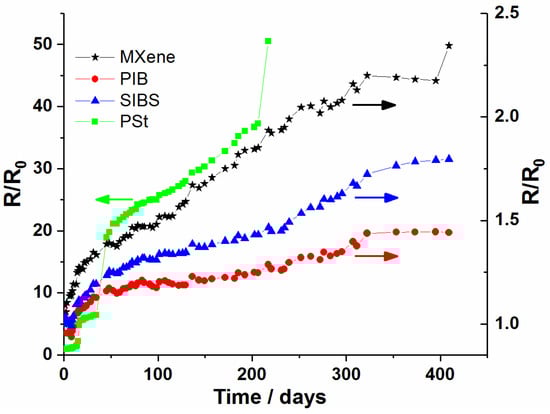 To assess the stability of the obtained systems, we investigated the degradation of bare MXene film and polymer-coated MXene under ambient conditions (Figure 6). The degradation of MXene was monitored by a rise in the electrical resistivity of the films with time. Over 400 days, the resistivity of bare MXene films increased by ~2.5 times. As seen from Figure 6, the resistivity of PSt-coated MXene was increased significantly after 15 days of storage. The dramatic increases in R/R0 for PSt-coated MXene can be explained by the formation of microcracks in the MXene film due to the stresses created by the PSt coating. A loss of conductivity was observed for PSt-coated MXene films after 220 days of storage. The low stability of PSt-coated MXene films can be explained by detachment of MXene–PSt layers from glass caused by the deformation of polymers (Appendix B, Figure A4). This is due to the rigidity of the PSt coating. PIB- and SIBS-coated MXene films proved to be much more stable against oxidation: after 400 days of storage, the resistivity increased by 1.8 and 1.4 times, respectively. Thus, isobutylene-based polymer coatings are more promising for the protection of MXenes against oxidation under ambient conditions. The flexibility of PIB and SIBS polymer coatings does not cause peeling of the MXene films during storage. The hydrophobicity of PIB and SIBS polymer coatings prevents diffusion of polar water molecules to the surface of MXene particles. In addition, the low oxygen permeability of PIB- and SIBS-based coatings has been previously shown [36]. Moreover, the stability test of bare MXene films and PIB- and SIBS-coated MXene under an oxygen atmosphere has additionally confirmed the low oxygen permeability of these polymers (the experimental details are presented in Appendix A).