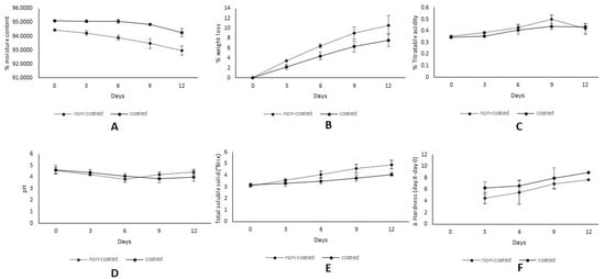 The total soluble solids (TSS) determination can reflect the fruit’s maturity level. Soluble solids widely found in fruits are glucose, fructose, and maltose. The results (Figure 1E) showed that during storage, an increase in total soluble solids was observed for both treatments and with the coated tomatoes and was found to be lower. Coated tomatoes’ TSS increased from 3.17 on day 0 to 4.08 on day 12. Meanwhile, for non-coated tomatoes, the pH increased from 3.08 to 4.92 from day 0 to day 12, respectively. The result indicates that the ripening process of coated tomatoes is slower than non-coated tomatoes. During ripening, the polysaccharides are hydrolyzed into their simple form, such as reducing sugar and other water-soluble compounds and used as the respiration substrate []. Therefore, the higher the maturity level of the tomatoes, the higher the TSS value, which means that the tomatoes become sweeter. On the other hand, the A. vera gel coating caused the minor incline of the TSS of tomatoes, which could be due to the inhibition of respiration, which reduces the energy uptake that consequently decreases the hydrolysis of polysaccharides into a soluble solid [].