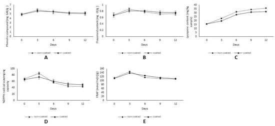 Results in Figure 2C showed an increase in lycopene content during storage. For coated tomatoes, the lycopene content increased from 15.77 mg/kg on day 0 to 31.48 mg/kg on day 12 of storage. Meanwhile, for non-coated tomatoes, the lycopene content raised from 15.74 mg/kg on day 0 to 35.74 mg/kg on day 12. There was a significant difference observed between coated and non-coated tomatoes in flavonoid content. During the ripening stage, lycopene content was increased due to degradation of chlorophyll and accumulation of lycopene in fruit []. Previous reports observed the increase in lycopene in stored tomatoes. During storage, the non-coated tomatoes exhibited a higher increase in lycopene content than the coated group and the delay of color change in the A. vera-coated fruit. The application of A. vera as a coating agent prevents the degradation of chlorophyll and the accumulation of lycopene in the ripening stage. In addition, the A. vera coating act as a barrier to air and moisture, thus decreasing the respiration rate of fruit [,].