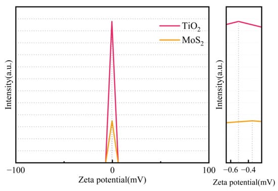The zeta potential of TiO2 and MoS2 was determined by Nanometrics (Malvern Zetasizer Nano ZS90, malvernpanalytical). Figure 1 shows the zeta potential diagrams of TiO2 and MoS2 measured at 25 °C. The measured electronegativity results are shown in Table 1. On the basis of Figure 1 and Table 1, it is shown that TiO2 and MoS2 have similar electronegativity. Therefore, MoS2 was added to the TiO2 dispersion, and both were deposited on the anode during electrophoresis deposition.