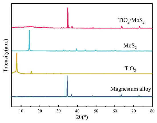 XRD patterns of magnesium alloy, TiO2, MoS2, and TiO2/MoS2 films.