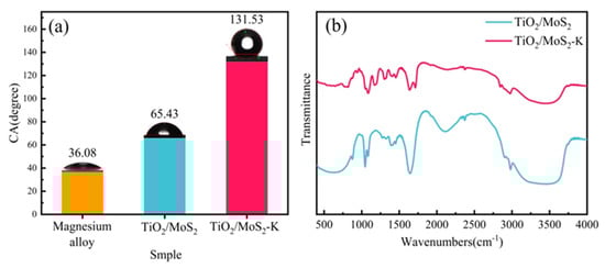 (a) Contact angles of magnesium alloy, TiO2/MoS2, and TiO2/MoS2-K; (b) FT-IR spectra of TiO2/MoS2 and TiO2/MoS2-K.