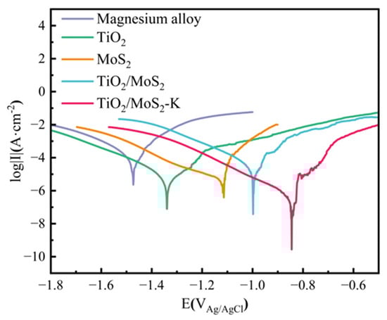 Figure 6 shows the potentiodynamic polarization curves of all the samples in 3.5 wt % NaCl aqueous solution. The results of the test are summarized in Table 2. On the basis of Figure 6 and Table 2, it is shown that the corrosion current density (Icorr) of the magnesium alloy decreases after electrophoresis. The polarization curve shape of the sample after deposition is similar to that of the magnesium alloy substrate, indicating that the 2D films do not change the corrosion kinetics process of the magnesium alloy. The contact between the substrate and the corrosion medium is isolated by the surface thin film, which improves the corrosion resistance of the magnesium alloy to a certain extent. The corrosion potential (Ecorr) of the AZ31B magnesium alloy is −1.47 V and the Icorr is 6.81 × 10−4 A·cm−2, indicating that the corrosion resistance of the magnesium alloy matrix is poor [58]. The results show that the Ecorr of TiO2/MoS2-K has a higher potential compared with TiO2, MoS2, and TiO2/MoS2 composite coatings. Among them, TiO2/MoS2-K has the lowest Icorr. The Icorr values for the TiO2 and MoS2 surface layer are 5.13 × 10−6 and 2.19 × 10−5 A·cm−2, respectively, whereas that of the TiO2/MoS2 film is 3.69 × 10−7 A·cm−2. The Icorr of the TiO2/MoS2 film decreases by two orders of magnitude compared to the MoS2 film, which is due to the dense state of the TiO2/MoS2 coating. The Ecorr of the TiO2/MoS2-K film is −0.85 V, and the Icorr is 6.73 × 10−8 A·cm−2. Compared with the TiO2/MoS2 film, the Ecorr of the TiO2/MoS2-K film shifted positively by 0.15 V, and the Icorr decreased by six times. This indicates that the KH570 modification improved the corrosion resistance of the TiO2/MoS2 protective layer, which is ascribed to its effectively isolating the magnesium alloy from contacting the corrosive liquid.