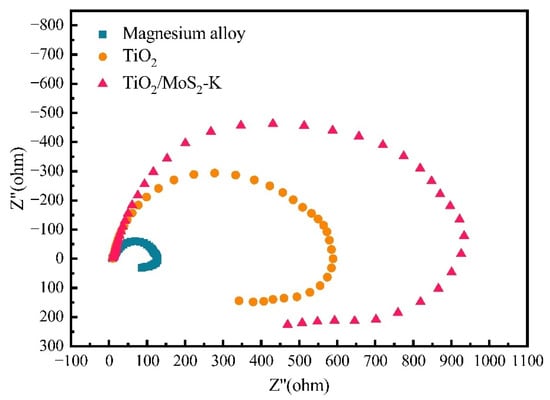 To further characterize corrosion resistance, we used EIS to analyze the anticorrosion of the sample. Figure 7 shows the electrochemical impedance spectroscopy of magnesium alloy, TiO2, TiO2/MoS2-K. The electrochemical impedance spectroscopy data are described in detail by the numerical fitting of experimental data. The corresponding equivalent circuit was selected to fit the impedance data, as shown in Figure 8. The fitting circuit of the magnesium alloy substrate is shown in Figure 8a, and the fitting circuit of the samples with TiO2 film and those with TiO2/MoS2-K films is shown in Figure 8b [59]. The results are shown in Table 3. The circuit involves the solution resistance (Rs), the charge transfer resistance (Rct) of the Mg particles, and the electric double-layer capacitance (CPEdl) at the interface between the electrolyte and magnesium particles. Rp is the inductance resistance, and CPLfilm is the inductance, corresponding to the electrode reaction between the film layer and the electrolyte interface. It is reported that Rct is closely related to the corrosion process, that is, the higher the Rct, the better the corrosion resistance. It can be seen from the results that the impedance radius of the TiO2/MoS2-K sample is the largest, and the Rct value is the largest at 871.9 Ω·cm2, which is significantly higher than that of the magnesium alloy sample and the sample with the TiO2 film. It shows that the corrosion resistance of TiO2/MoS2-K is the highest, which is consistent with the results of the polarization curve.