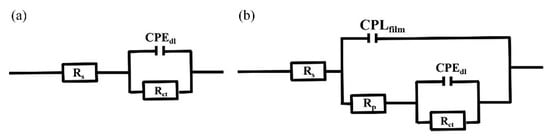 Equivalent circuits for EIS spectra: (a) magnesium alloy, (b) TiO2 thin film and TiO2/MoS2-K thin film.