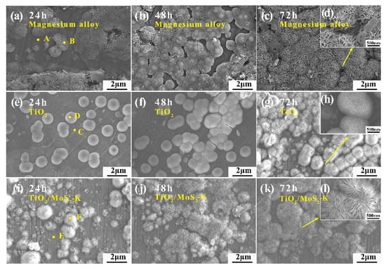 The microstructure of the sample surface after salt spray test at different times. Magnesium alloy: (a) 24 h, (b) 48 h, (c) 72 h; TiO2 film: (e) 24 h, (f) 48 h, (g) 72 h; TiO2/MoS2-K film: (i) 24 h, (j) 48 h, (k) 72 h. The (d,h,l) insets are partial enlargements of (c,g,k), respectively.