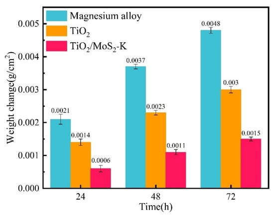 Figure 10 shows the salt spray corrosion weight gain of the magnesium alloy samples after electrophoretic deposition of TiO2 and TiO2/MoS2-K films. The weight gain rate of the sample with TiO2/MoS2-K is higher at the beginning of the test than that of the magnesium alloy sample and the sample with TiO2 coating. With increasing salt spray corrosion time, the weight gain rate of the sample gradually slows down because the corrosion products on the surface of the sample increase, which hinders the continuous reaction of chloride ion contact with the magnesium alloy surface. In addition, the weight gain of the sample with the TiO2/MoS2-K film is significantly lower than that of the former two samples, and the corrosion rate is the lowest. This result indicates that the TiO2/MoS2-K protective layer delayed the corrosion of the magnesium alloy to a greater extent and had the best corrosion resistance.
