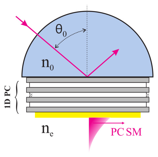 The one-dimensional photonic crystal (1D PC) is a simple periodic multi-layer stack. Optical surface modes in 1D PCs were studied in the 1970s, both theoretically [3,4] and experimentally [5]. Twenty years later, the excitation of optical surface modes in a Kretschmann-like configuration was demonstrated [6,7]. A scheme of the Kretschmann-like excitation of PC SMs is presented in Figure 1. In recent years, the PC SMs have been used in ever-widening applications in the fields of optical sensors [8,9,10,11,12,13,14], optical biosensors [15,16,17,18,19,20,21,22,23] and in other fields [24,25,26,27,28,29,30].