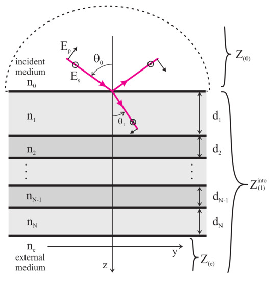This procedure should be continued recursively from the last layer (where, on the first iteration, would be replaced by ) – to the first layer until is obtained. The equation for reflection coefficients of s- or p-polarized waves from any complex multilayer (see Figure 2) has a very simple form in the impedance terms: