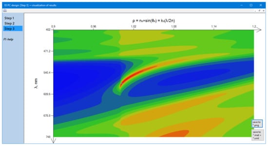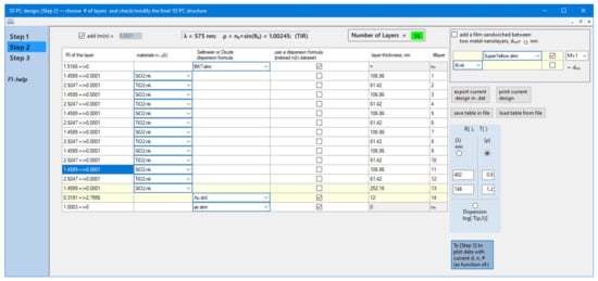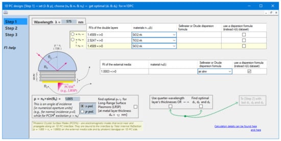 The design of 1D PC structures in the program is divided into three simple steps. After starting the program, the window of Step 1 appears (see Figure 3). In this window, the user must select the double layer materials ( and ) and set the (central) wavelength and angle of incidence of the optical waves. If the angle of incidence is greater than the TIR angle (), the program will also calculate the final layer thickness (with RI ) that sustains the surface optical modes. But if the user sets (no TIR), the program will not calculate the final layer (sustaining surface optical modes), and in the following steps it will only be possible to calculate reflection and transmission through 1D PC (without PC SM).