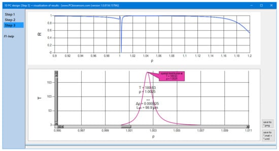 Various approaches and strategies have been proposed to find the optimal parameters of the 1D PC structure and the thickness of the terminated layer [31,32,33,34]. Here, to solve this problem, we present a free Windows program [35] based on an impedance approach, which was used in [36,37]. This software permits both modeling and visualization of parameters of an 1D PC structure before submitting it for fabrication.