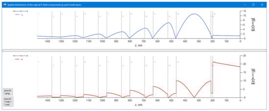It is also possible to choose any point of the angular dependence to visualize the spatial distribution of the field (see Figure 6) at the selected angle . One can see in Figure 6 that the electromagnetic fields reach their minimum in the center of the metal film (layer #14), which minimizes total losses in the metal film when the condition (13) is satisfied. This condition for can be selected in the Step 1 by an appropriate checkbox. The dispersion of the structure can also be calculated and visualized in the form of transmission field enhancement near the interface , as shown in Figure 7. It should be noted that the program considers the incident wave as a plane wave (i.e., as an infinite flat front) and makes all calculations under this assumption. If the incident wave is constrained (e.g., focused to a size smaller than the propagation length of PC SMs), then additional fine interference structures may appear on experimental reflection curves, as described in [44].