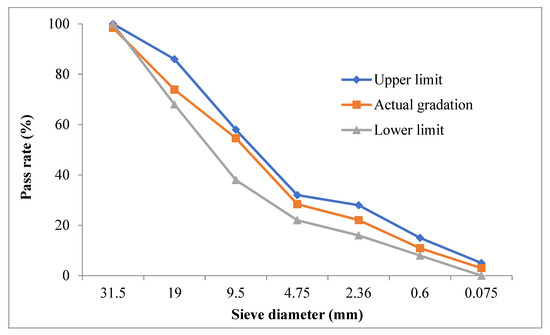 Skeleton-dense cement stabilized aggregate was used in this experiment. Limestone was used as aggregate. The grade of cement stabilized skeleton-dense aggregate, which indicated that the cumulative pass rate of different sieves varied. They were tested according to Test Methods of Aggregate for Highωay Engineering (JTG E42—2005) and the result is shown in Figure 1. The properties of cement, including the cement fineness, setting time, and strength of cement mortar were verified to identify the performance of cement. These properties met the Technical Guidelines for Construction of Highway Roadbases (JTGT F20-2015) and were tested according to Test Methods of cement and cement concrete of Highway Engineering (JTG 3420-2020). As presented in Table 1, the cement dosage was 5%.