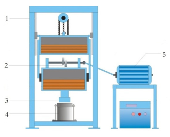 Indoor vibration-compaction mechanic structure. 1—Mechanics frame; 2—eccentric block; 3—indenter; 4—compaction barrels; 5—electric motor.