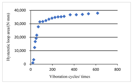 Figure 5 shows the first two cycles. The displacement and compaction pressure increased quickly. The displacement increment of the two adjacent cycles was as high as 0.2 mm (shown as the displacement-time curve on the left top of Figure 5) if the material was loose and easy to compact. In this stage, the force-displacement hysteresis curve was not closely spaced and hardly overlapped. As mentioned in Section 2.2.3, three parallel experiments were carried out, and the (mean area value of hysteresis curve) was 305.9 N·mm, (the standard deviation of the hysteresis-curve area) was 23.25, and the increment of the hysteresis-curve-area value was nearly the same. The force-displacement-curve area increased rapidly, which indicated that the energy absorbed by the compacted material increased quickly.