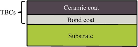 As a multilayer structure, TBCs can effectively reduce the substrate temperature, and maintain the machinability and reliability of the alloy substrate. The cross-sectional view of TBCs structure is shown in Figure 1 []. The substrate is composed of nickel-based or cobalt-based superalloys with sufficient mechanical strength. The TBCs consist of two parts: a ceramic coat and a bond coat. The ceramic coat is composed of and (YSZ). Its outstanding thermal insulation performance can protect the substrate from oxidation, corrosion and erosion. The bond coat is an antioxidation layer composed of NiCrAlY or NiCoCrAlY alloy. It is used to firmly adhere the ceramic coat to the substrate, so as to reduce the mismatch stress caused by the different thermal expansion coefficients of the ceramic coat and substrate.
