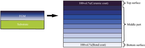 where n denotes the gradient index. h denotes the thickness of the FGM structure. z denotes the coordinate in the layer thickness direction, ranging from to . In Figure 2, the top surface is pure ceramic coating (i.e., , , ), while the bottom surface is pure bond coating (i.e., , , ). The middle part is the functionally graded structure composed of ceramic and bond materials.