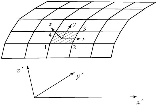 The element stiffness matrix in the local coordinate system was derived in the previous subsection. For the complexity of the turbine blade surface, the coordinate systems needs to be modified. Figure 4 displays the global coordinate system and local coordinate system of finite elements. In this study, , and are the three directions of the global coordinate system. x, y and z denote the three directions of the local coordinate system. Note that x and are parallel to each other.