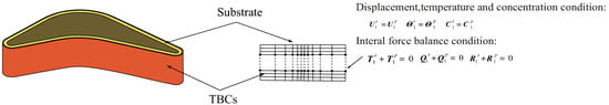 In this section, the governing equations of the TBCs and the substrate for the turbine blade are formulated. In order to ensure the compatibility of nodes and elements on the TBCs/substrate interface, the compatibility conditions of displacement, temperature and concentration at the interface are defined, as shown in Figure 6. The meshing of the TBCs is based on the outward free surface of the substrate. Finally, the governing equation of the overall blade structure is assembled.