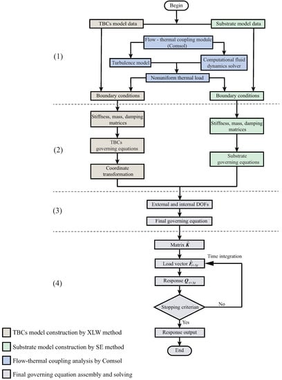 (1) The models of TBCs and substrate are input into the XLW/SE method to start the program. For each model, the boundary conditions of temperature, concentration and displacement are defined. For the flow–thermal coupling problem, the SST model based on the RANS method is used as the turbulence model. By using the fluid dynamics solver provided by COMSOL, the nonuniform thermal load is obtained and then input into the XLW/SE method to calculate the mechanical response of blade structure.