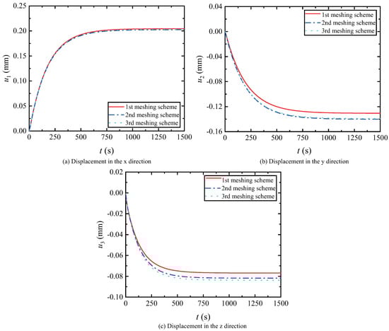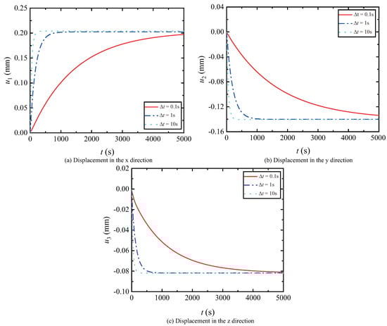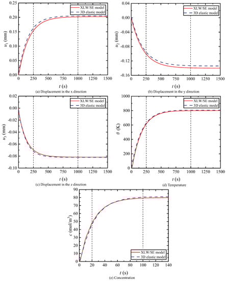 (4) The iteration of the time integration is performed. Referring to Equation (40), the equivalent stiffness matrix and load vector are calculated. Then, referring to Equation (39), the responses of temperature, concentration and displacement at time are calculated. The iteration is stopped when the stopping criterion is satisfied.