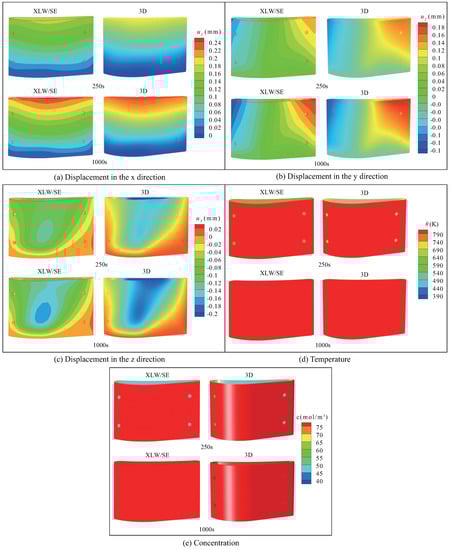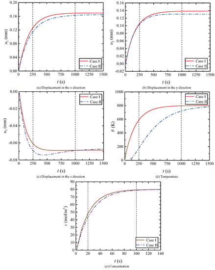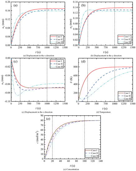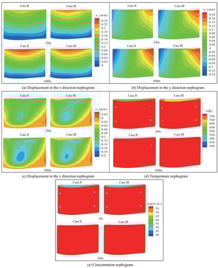 At point B, the dynamic responses of displacement, temperature and concentration are shown in Figure 16. The corresponding nephograms of the TCM responses at 250 s and 1000 s are presented in Figure 17. By comparing Case 1 and Case 3, it is found that the delamination prevents the conduction of temperature and concentration, leading to a delay for the response curves to stabilize, and the displacement amplitude is smaller than that of Case 1. By comparing Case 2 and Case 3, it can be found that there are differences in the time-varying curves of , and at Point B, and this difference is gradually increasing with time. At the same time, the temperature and concentration response curves are also further affected, and the conduction process becomes slower, which is caused by the combined effect of delamination and debonding. The delamination has a significant effect on the transient value of the temperature change and concentration, but no influence on the steady-state value.