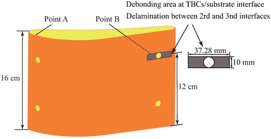 The spalling of TBC during service results in the generation of a debonding area and even the failure of the TBC system. This section simulates the effect of TBC debonding on TCM responses (i.e., displacement, temperature and concentration distribution) in the layer thickness direction. The working conditions of the blade structure were the same as those in the previous section. Since the material of TBCs was functionally graded, the top layer and bottom layer were pure and NiCoCrAlY, respectively. Two cases were considered: (i) Case 1: aero-engine turbine blade without debonding at the interface; (ii) Case 2: aero-engine turbine blade with debonding at the interface. The interface between the coating and substrate can exhibit debonding damage, as shown in Figure 14.