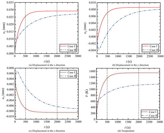 Two cases were considered: (i) Case 1: turbine blades with uniform temperature; (ii) Case 2: turbine blade with uneven temperature. For point C (1 cm, 5.01 cm and 3.24 cm) at the base interface near the cooling hole, the distributions of displacement, temperature vs. time are shown in Figure 20. It can be found that compared with a uniform temperature, the turbine blade at a nonuniform temperature is affected by air-film cooling, resulting in inconsistent temperature values in each part of the blade wall surface. The convergence rate of displacement and temperature with time is affected, and the amplitude of each physical quantity decreases to a certain extent. The corresponding nephograms at 500 s and 2000 s are presented in Figure 21.