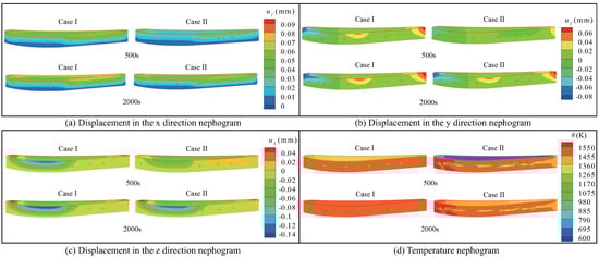 Nephograms of thermo–mechanical responses in Case 1 and Case 2.