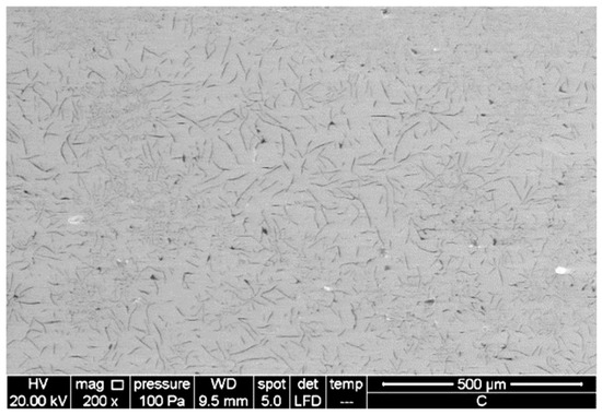 Figure 1 presents a typical microstructure of cast iron containing graphite. The graphite form in the cast iron is classified according to ISO 945-1:2017 [16]. The view of the cast iron microstructure in Figure 1 shows the flake graphite that, according to the standard, is marked as type IA.