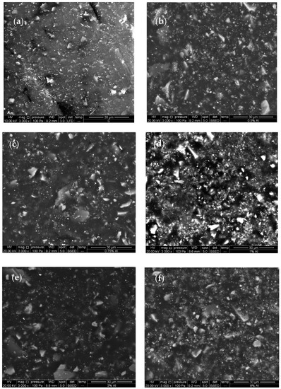 By adding the Al NPs to the epoxy matrix, the content by weight continually increased up to the mass concentration of 1% (Table 2). For samples in which 3.0 and 6.0% Al NP was added, the EDS analysis showed that there was a lower concentration of it. This was probably due to the formation of larger accumulations of nanoparticles and their uneven dispersion. Figure 5 shows the SEM micrographs that were obtained by analysing the cast iron surface that was coated with (a) the epoxy matrix without Al NP, and with (b) 0.50% Al NP, (c) 0.75% Al NP, (d) 1.0% Al NP, (c) 3.0 % Al NP, and (d) 6.0% Al NP before their immersion in an aggressive medium.