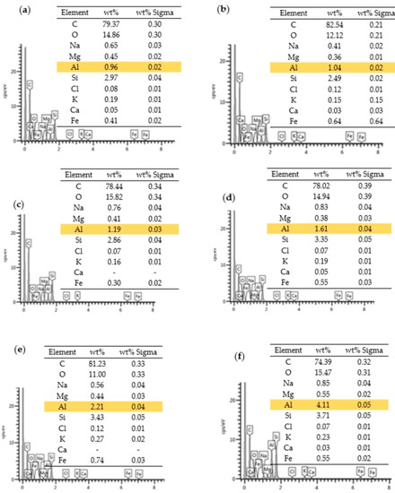 EDS spectra and overview of chemical composition of (a) epoxy matrix without Al NP and epoxy matrix with (b) 0.5%, (c) 0.75%, (d) 1.0%, (e) 3.0%, and (f) 6.0% Al NP.