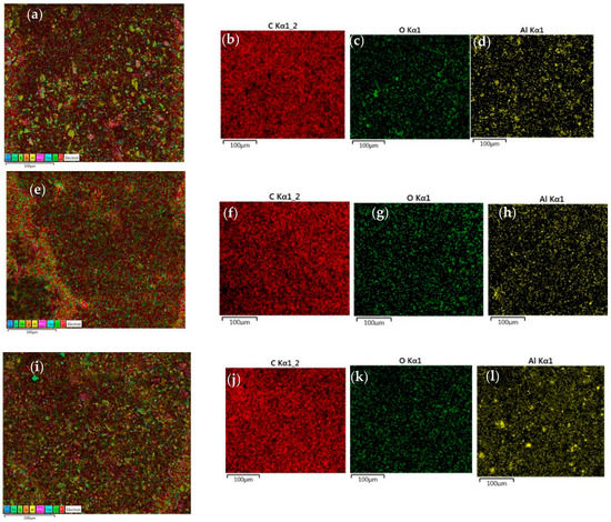 EDS mapping of the epoxy matrix (a) without adding Al NP, with (e) 1.0% Al NP and (i) 6.0% Al NP. Overview of the distribution of carbon (C), oxygen (O), and aluminium (Al) in epoxy coating (b–d) without adding Al NPs and with (f–h) 1.0% Al NP and (j–l) 6.0% Al NP.