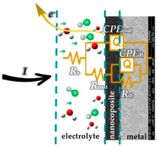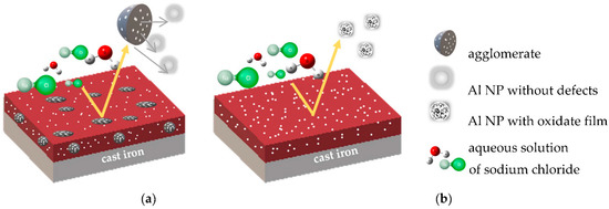 Figure 12b shows the behaviour of the nanocomposite where no agglomeration occurred, that is, the figure shows the successful incorporation of the nanoparticles in the organic film which is based on the reactions in Figure 11. Pure aluminium that is in contact with air or moisture is a thermodynamically reactive metal with an extremely negative value of the standard electrode potential (−1.66 V). However, in neutral aqueous solutions, the aluminium showed a positive potential value of −0.6 V, meaning that a thin protective layer was formed on its surface [30]. When it is i contact with the aqueous solution of NaCl and by the influence of the impressed current I, during the measurement of the EIS spectrum, the aluminium nanoparticles will oxidise, which will lead to a reduction in the amount of water according to the following equations: