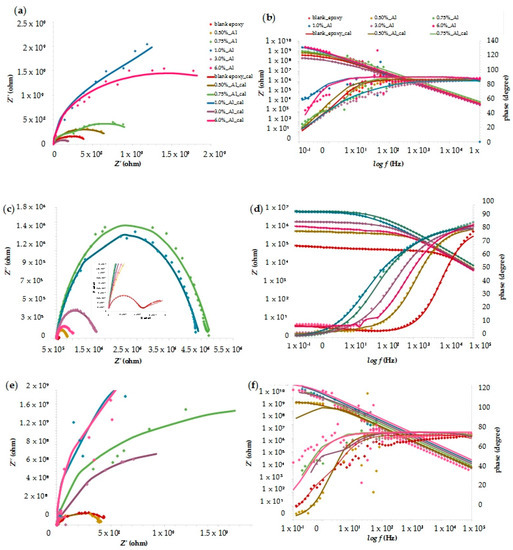 The Nyquist and the Bode plots for the epoxy matrix without the Al NPs and the prepared nanocomposites with 0.5%, 0.75%, 1.0%, 3.0%, and 6.0% Al NPs are shown in Figure 9. The impedance spectrum was recorded immediately after the immersion in 3.5% NaCl solution (Figure 9a,b), and after 10 days or 240 h (Figure 9c,d). For the samples that were exposed to the icing and de-icing processes in the climatic chamber, the impedance spectrum was also recorded (Figure 9e,f).