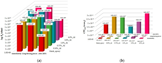 Overview of (a) coating resistance (Rp) and (b) constant phase element (CPEcoat) for epoxy matrix without Al NP, and prepared nanocomposites with 0.50%, 0.75%, 1.0%, 3.0%, and 6.0% Al NP, immediately and after 240 h exposure in aggressive medium (3.5% NaCl), and after testing in climatic chamber.