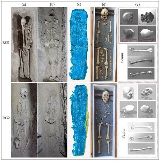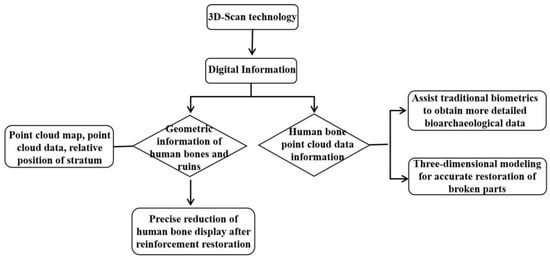 The digital information obtained by 3D technology can be used to establish archaeological archives of cultural relics; it can also be used to combine the traditional biometric techniques to conduct biological archaeological research on human bones [13,14,15,16]. More importantly, with accurate digital point cloud data, these digital information data can be used to establish the unearthed location coordinates of cultural relics, which is convenient for the restoration and display of the original site at later times, and the real location of the cultural relics can be restored and displayed at the excavation site. Additionally, the quantitative comparison of the point cloud data, excluding the comparison of the current picture, is supplemented with the original comparison data before restoration, facilitating a detailed comparison of bone cultural relics before and after restoration and refined restoration guidance [17,18,19].