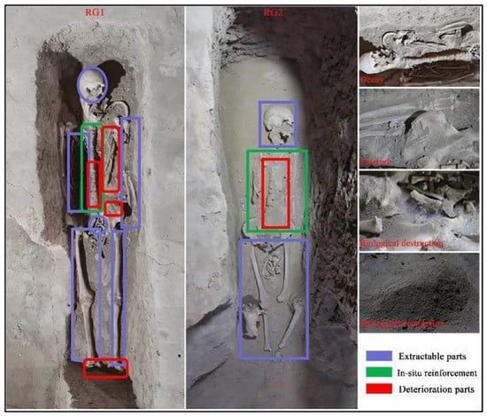 According to the survey results (as shown in Figure 4), the main problems affecting the remains of the Shenna ruins were decay, fracture, biological pests, etc. The spine, pelvis, and ribs tend to be more decayed and powdered due to their innate structural features, and could hardly be touched. The problems with the limbs and bones were relatively mild. After creating a comprehensive record of the human bone diseases at the Shenna ruins, we extracted and evaluated some of the scattered bones, such as the skulls and limbs, which accounted for about 60% of the remains, and we reinforced the remaining bones and embedded soil in situ.