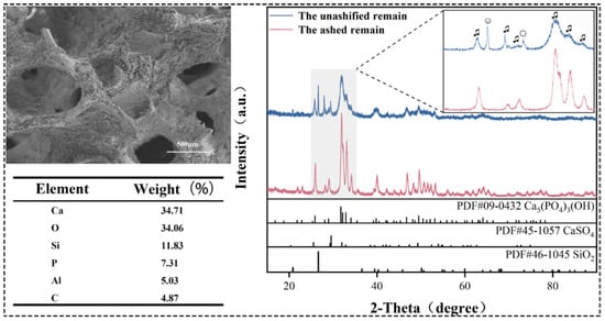 The pH value was between 7.8 and 8.2, which indicates that the environment in which the human bones were buried was alkaline, which is unfavorable for the preservation of the organic components in the bones, which directly leads to protein hydrolysis and a decline in the connection capacity between the inorganic structure and organic components, which in turn leads to the occurrence of diseases such as embrittlement and powdering, as was found in the bone cultural relics. The test results showed that the inorganic mineral composition in the soil was CaCO3 and SiO2; the longer bones are buried underground, the more minerals will gradually replace the organic components in the bone and fill the gaps and micropores, resulting in bone mineralization and a loss in the value of the archaeological information of the deep excavation. However, through XRD tests before and after obtaining the human bone ashes at the Shenna site, we found that although the remains had many diseases and the inorganic structure was destroyed, their mineral composition had not changed, so they were not contaminated, meaning further research can still be carried out. The SEM-EDS results (as is shown in Figure 6) also confirmed from a microscopic perspective that the remains were affected by various factors that caused the porosity and mechanical strength of the remains to be reduced, meaning that we have a more comprehensive and detailed understanding of the preservation status of the remains.