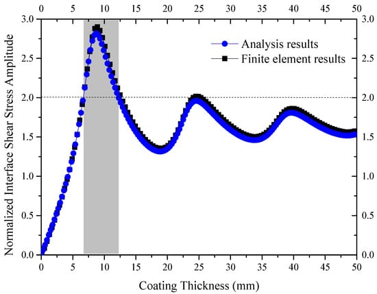 Taking the thin frost coating on an aluminum matrix as an example, the analytical solution of the normalized interfacial shear stress amplitude is calculated by the adaptive Gauss–Kronrod quadrature numerical integration method, which is verified by finite element solutions, see Figure 2, Figure 3 and Figure 4. The interval of interfacial shear stratification is obtained. The material parameters are shown in Table 1.