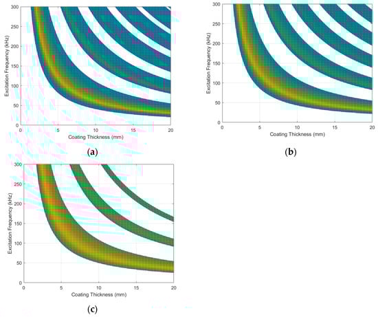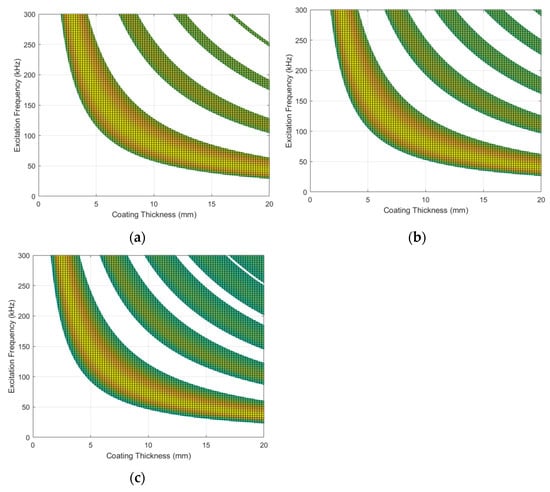 As shown in Figure 8, in the interfacial shear delamination interval, the excitation frequency increases with the decrease of coating thickness. Interfacial shear delamination intervals become narrower and narrower when the substrate is molybdenum, steel, and titanium in order. The higher the frequency of the elastic wave, the easier it is to propagate through the thinner coating. As the substrate is molybdenum, steel, and titanium in order, with the coating thickness increasing from 2 mm to 20 mm, the first coupling resonance frequency decreases from 300 kHz to 40 kHz, 43 kHz, and 46 kHz, respectively.