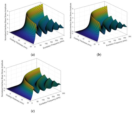 The normalized amplitude of interfacial shear stress in the excitation frequency domain and the coating thickness domain as the coating is frost and the substrate is molybdenum (a), steel (b) and titanium (c).