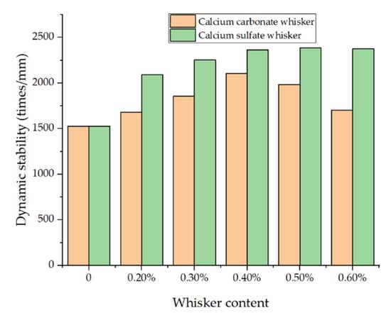 Figure 3 shows the dynamic stability test results of asphalt mixtures with different dosage levels of calcium sulfate whisker and calcium carbonate whisker.
