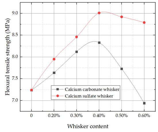 In Figure 4, it can be seen that: In a certain level range, the flexural tensile strength of asphalt mixture increases with the increase of calcium sulfate whisker and calcium carbonate whisker. When the amount of calcium sulfate whisker reaches 0.4%, the flexural tensile strength reaches a maximum of 9.01 and 8.33 MPa, respectively, which is 24.4% and 15.1% higher than that of asphalt mixture without whisker. When the yield level of whisker exceeds 0.4%, the flexural tensile strength of asphalt mixture slightly decreases with the increase of whisker content level, and the degree to which calcium carbonate whisker increases the flexural tensile strength of asphalt mixture is lower than that of calcium sulfate whisker.