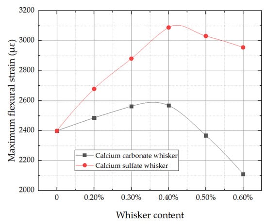 As can be observed from Figure 5, in a certain dosage level interval, with the increase of whisker content, the maximum bending tensile strain of asphalt mixture increases; when the dosage level reached 0.4%, maximum bending tensile strain reached a peak of 3089 and 2568 mu epsilon, respectively, compared with the asphalt mixture without whisker, the maximum flexural strain increased by 28.8% and 7%, respectively. When the content of calcium sulfate exceeds 0.4%, the maximum flexural strain of asphalt mixture decreases with the increase of whisker content. Calcium carbonate whisker has little effect on improving the maximum flexural strain of asphalt mixture.