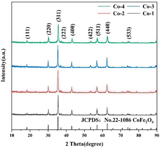 The experimental parameters (cobalt salt gradient (0.2 g, 0.25 g, 0.3 g, 0.35 g as Co-1, Co-2, Co-3, Co-4) where carbon nanotubes were 4 mg) were adjusted to achieve the modulation of the microstructure of spinel ferrites, to investigate the effect of micro-structural changes on the absorbing properties of the samples. The cobalt and iron salts were varied together, and they were added in multiples of 0.8, 1, 1.2, and 1.4 based on 0.25 g of cobalt salt and 0.54 g of iron salt as a reference. Finally, the stoichiometry of the cobalt salt was chosen as the standard to differentiate the four samples. The ratio of cobalt salt to iron salt did not change; what changed was the amount added. By adjusting the ratio of cobalt salts, it is the amount of cobalt and iron salts added that adjusts the microstructure of the material