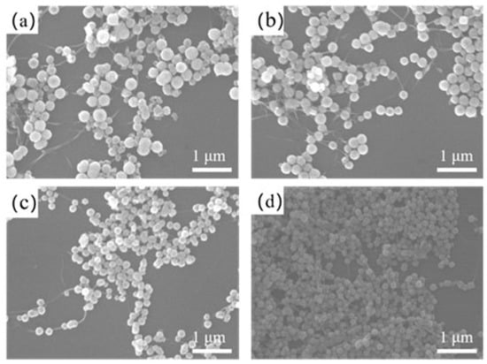 The microscopic morphology of the CoFe2O4/SWCNTs composites was characterized using SEM, and the morphology of the sample under the cobalt salt gradient is shown in Figure 3. The sample is composed of spherical nanoclusters and cylindrical carbon nanotubes, and the nanospheres wrap around the carbon nanotubes to form a necklace-like structure. SEM of Figure 3a–d clearly shows that the number and distribution density of spherical CoFe2O4 clusters obtained by adding different amounts of cobalt salts are significantly different at a carbon nanotube content of 4 mg. With the gradual increase in the cobalt salt content, the number of CoFe2O4 microspheres increases, and the spheres become more uniform in size but with little change in size. It is not difficult to understand that the increase in cobalt salt concentration will produce more CoFe2O4 microsphere nanocrystals and increase the loading capacity of CoFe2O4 microspheres on the surface of single-walled carbon nanotubes, the interface in the material increases, and the necklace-like structures pile up with each other to form a network. It provides the conditions for improving wave absorption performance.